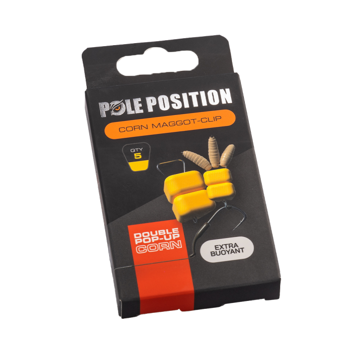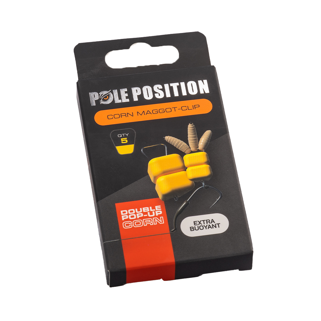 De Corn Maggot Clip van Pole Position is een innovatieve madenclip die een drijvende imitatie maïskorrel als basis heeft. Deze combi is onweerstaanbaar voor karper, zeelt, grote brasem en winde. Verkrijgbaar in een enkele en een dubbele variant, waarbij die laatste genoeg drijfvermogen heeft om een haak maat 4 volledig van de bodem te tillen.