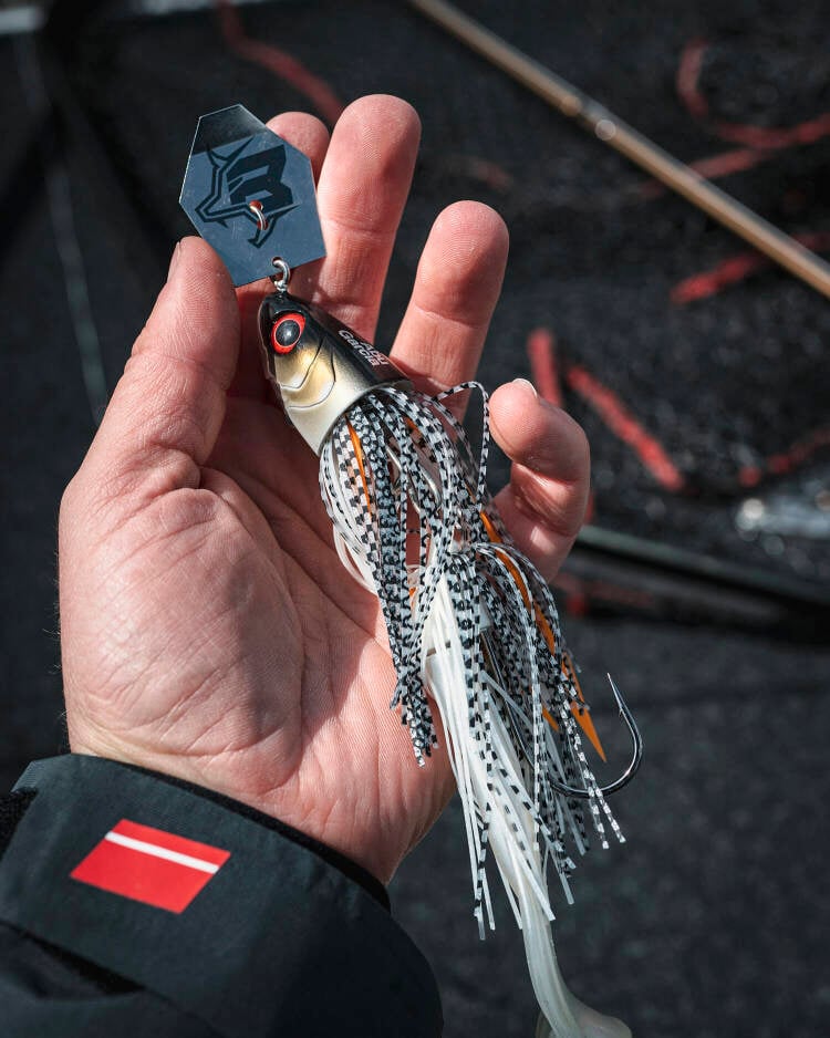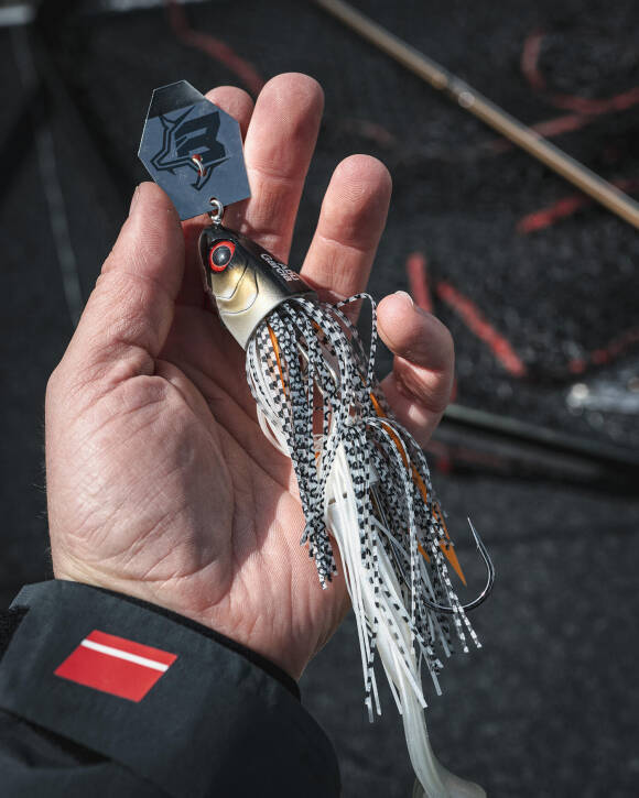 De Beast Bladed Jig van Abu Garcia is een grote chatterbait die veel herrie maakt – ook vanwege de ingebouwde ratel. Voorzien van een extra bevestigingsoogje aan de onderkant voor het monteren van een kopdreg of extra verzwaring om hem dieper te vissen. Lengte: 25 cm, gewicht: 50 gram.