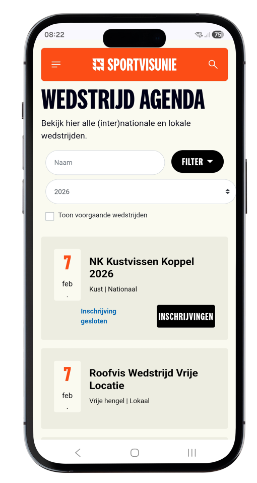 In de wedstrijdagenda van de Sportvisunie staan alle lokale, regionale, nationale en internationale wedstrijden vermeld. Het inschrijven voor regionale en nationale wedstrijden verloopt ook via de agenda – daarvoor gebruik je de laatste acht cijfers van je VISpas. Bovendien worden binnen deze omgeving ook de wedstrijduitslagen gepubliceerd. Voor een optimale navigatie in de agenda kun je in het menu onder meer filteren op hengelsportdiscipline en de zoekfunctie gebruiken.