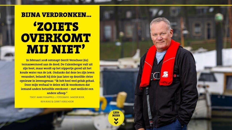 In februari 2018 ontsnapt Gerrit Verschoor (62) ternauwernood aan de dood. De Culemborger valt uit zijn boot, maar wordt op het nippertje gered uit het koude water van de Lek. Ondanks dat deze les zijn leven verandert, belandt hij drie jaar later op dezelfde rivier opnieuw in levensgevaar. “Ik heb heel veel geluk gehad. Door mijn verhaal te delen wil ik voorkomen dat iemand anders hetzelfde overkomt – met wellicht een andere afloop.”