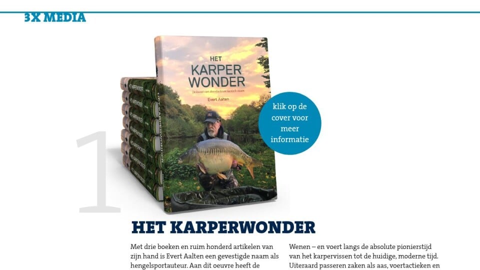Met drie boeken en ruim honderd artikelen van zijn hand is Evert Aalten een gevestigde naam als hengelsportauteur. Aan dit oeuvre heeft de bekende Utrechtse karpervisser recentelijk een nieuw boek toegevoegd: Het Karperwonder. In bijna 400 full color pagina’s neemt hij de lezer mee op een persoonlijke tijdreis van vijftig jaar. Die begint met de wedstrijdvisserij in de jaren ’60 & ’70 – Aalten deed in 1978 zelfs mee aan het WK in Wenen – en voert langs de absolute pionierstijd van het karpervissen tot de huidige, moderne tijd. Uiteraard passeren zaken als aas, voertactieken en aaspresentatie de revue, maar is er ook ruimte voor sfeer en nostalgie. Deze terugblik op vier decennia karpergeschiedenis laat zien dat kennis, ervaring en tactiek kunnen leiden tot grootse vangsten; en zelfs karperwonderen. Let op: de oplage is met slechts 1.000 exemplaren beperkt.