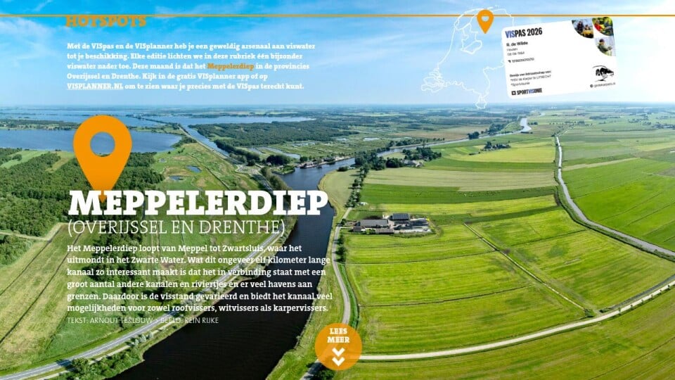 Met de VISpas en de VISplanner heb je een geweldig arsenaal aan viswater tot je beschikking. Elke editie lichten we in deze rubriek één bijzonder viswater nader toe. Deze maand is dat het Meppelerdiep in de provincies Overijssel en Drenthe. Kijk in de gratis VISplanner app of op VISPLANNER.NL om te zien waar je precies met de VISpas terecht kunt.
