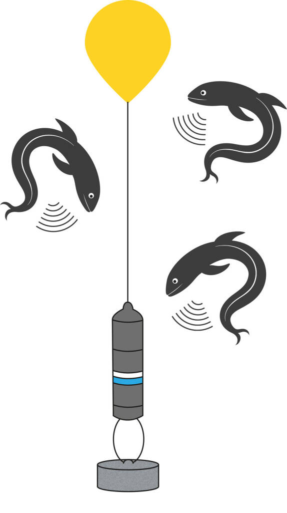Dankzij ‘akoestische telemetrie’ (de interactie tussen ontvangers en zendertjes) kunnen onderzoekers tegenwoordig heel precies de migratie van vissen volgen. Deze ontvangers zitten met een staalkabel vast aan een anker van beton en worden rechtop gehouden met een drijver. De zendertjes voor het schieraalonderzoek van Swimway Oude IJssel zenden elke 40 tot 60 seconden een uniek signaal uit, waardoor de ontvangers precies kunnen registreren welke vis op welk tijdstip in de buurt is. Blijft een vis nabij de ontvanger, dan ‘noteert’ de ontvanger heel veel registraties. De tijd tussen registraties van meerdere ontvangers laat zien hoe lang een vis nodig heeft om van de ene ontvanger naar de andere te zwemmen.
