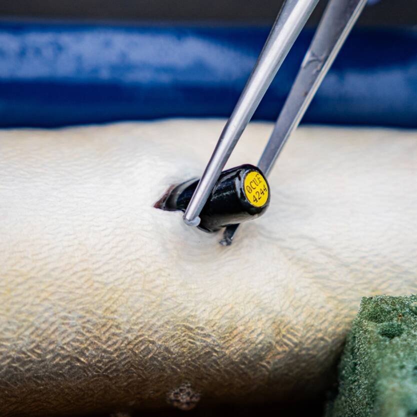 De schieralen worden operatief voorzien van een zender in de buikholte