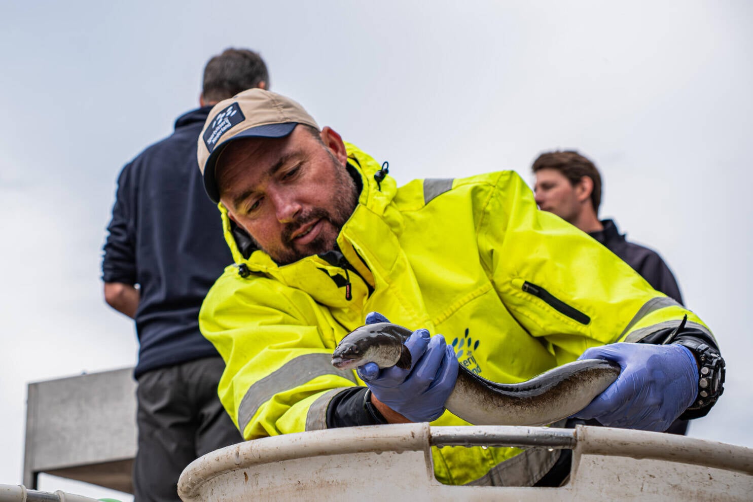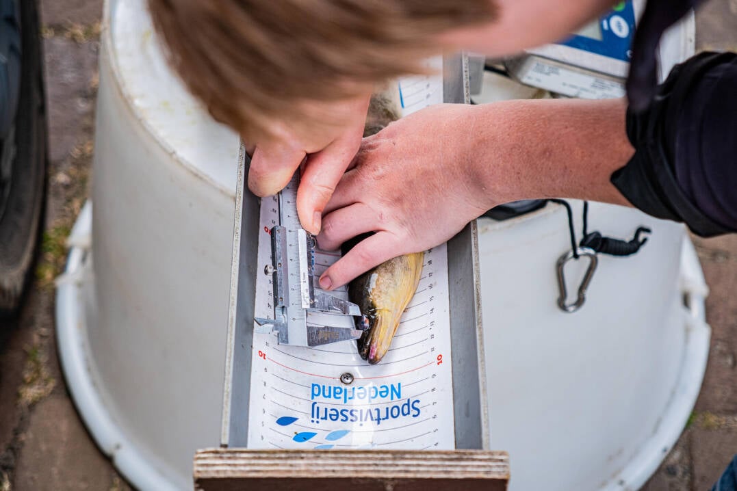 De schieraal neemt daarbij een bijzondere plek in, want dit is de enige van de vijf onderzochte soorten die voor het paairitueel stroomafwaarts trekt (van zoet naar zout). De schieralen die vandaag in de schijnwerpers staan zijn speciaal gevangen door een beroepsvisser; om precies te zijn in het stroomafwaartse deel van de IJssel. Vanuit een grote emmer gaan ze kort in een bak water met verdovingsmiddel, waarna onderzoekers elk exemplaar wegen en de lengte van de vis en de grootte van het oog en de borstvin meten. Aan de hand van deze cijfers bepalen ze de zogenaamde schieraalindex. Hoe hoger dit getal, hoe groter de kans dat de vis na de vrijlating aan zijn migratietocht naar de paaigronden begint.