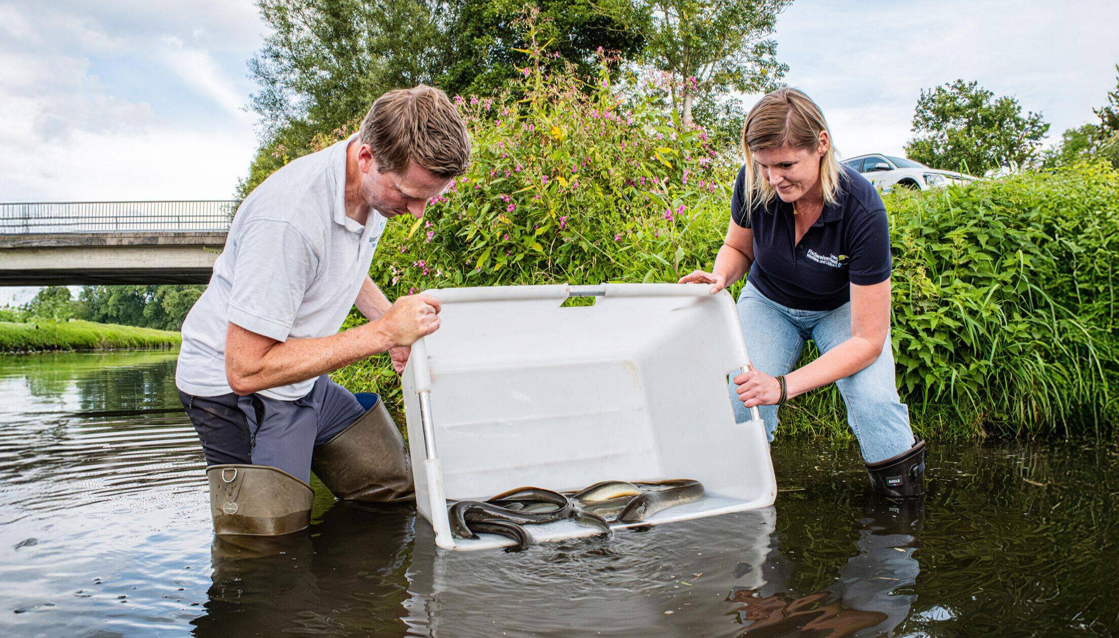 Het uitzetten van de ‘gemerkte’ schieralen gebeurt nog diezelfde dag. In twee batches van negentien exemplaren gaan ze op twee locaties in Duitsland te water. Dat zijn de Issel en de Aa-strang, twee bovenlopen van de Oude IJssel in Duitsland. Bij aankomst op elke uitzetplek laten de onderzoekers eerst beetje bij beetje rivierwater in de transporttank lopen, zodat de schieralen aan hun nieuwe omgeving kunnen wennen. Na pakweg een kwartier zijn de dieren klaar voor de uitzet, waarna ze hopelijk snel aan hun lange reis naar de Sargassozee beginnen. Ondertussen zorgen ze hoe dan ook voor waardevolle data over de migratie van de aal op deze rivier.