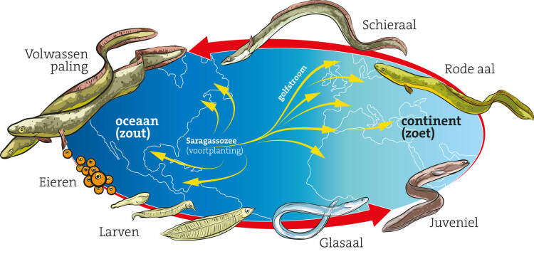 Schieraal is de wetenschappelijke term voor een bepaalde levensfase van de paling. De levenscyclus van Anguilla anguilla begint in de Sargassozee (voor de kust van Midden-Amerika). Na daar uit het ei te zijn gekomen drijven de ‘palinglarven’ met de golfstroom mee richting de Europese en Afrikaanse kust. Gedurende deze reis van vijfduizend kilometer – die zo’n twee tot drie jaar duurt – transformeren de larven tot glasaal. In het Europese binnenwater, zoals de Oude IJssel, groeit de glasaal uit tot een paling (‘rode aal’) en krijgt hij een bruin- tot grijsachtige kleur. Na zo’n vijf tot twintig jaar in zoetwater – mannetjes in de regel korter dan de vrouwtjes – is de vis klaar voor de voortplanting en spreken we van schieraal. Dan heeft-ie een donkerdere rug, een lichtere buik en grotere ogen. Voor de voortplanting zwemt de schieraal weer helemaal terug naar de Sargassozee, waar de inmiddels volwassen geworden paling na het paaien sterft.