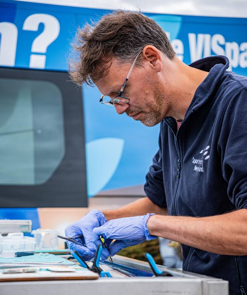 Na het wegen en meten wordt elke schieraal – nog steeds verdoofd, maar via een slangetje dat water langs de kieuwen laat stromen wel voorzien van zuurstof – met zorg en aandacht op de behandeltafel gelegd. Daar maakt een speciaal gecertificeerde medewerker van de Sportvisunie vervolgens een klein sneetje in de buikwand, precies op maat voor het zendertje dat in de buikholte gaat. Na het dichten van de wond met enkele hechtingen, gaat de schieraal in een bak water om bij te komen. Met wat zorg en hulp van een dompelpompje dat extra zuurstof naar de kieuwen stuurt, komt de vis al na een paar minuten weer bij.