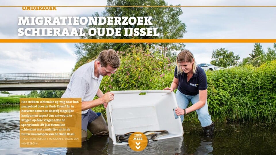 Het is eind augustus ’s ochtends vroeg al behoorlijk druk op de kade langs het Ramsdiep. Daar hebben medewerkers van de Sportvisunie, Waterschap Rijn en IJssel, en Landesfischerei-verband Westfalen und Lippe zich verzameld om tientallen schieralen te voorzien van een zender, waarna deze gezond en wel worden losgelaten in de Duitse bovenlopen van de Oude IJssel. Dit wordt gedaan in het kader van het project Swimway Oude IJssel, een internationaal vismigratieonderzoek naar vijf soorten (rivierprik, Europese meerval, winde, roofblei en schieraal). Doel van het project is het vergaren van extra kennis over vismigratie in deze rivier – met name over mogelijk knelpunten die vissen tegenkomen op weg naar hun paaigebied.
