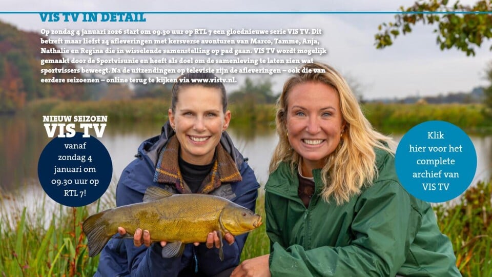 Op zondag 4 januari 2026 start om 09.30 uur op RTL 7 een gloednieuwe serie VIS TV. Dit betreft maar liefst 24 afleveringen met kersverse avonturen van Marco, Tamme, Anja, Nathalie en Regina die in wisselende samenstelling op pad gaan. VIS TV wordt mogelijk gemaakt door de Sportvisunie en heeft als doel om de samenleving te laten zien wat sportvissers beweegt. Na de uitzendingen op televisie zijn de afleveringen – ook die van eerdere seizoenen – online terug te kijken via www.vistv.nl.