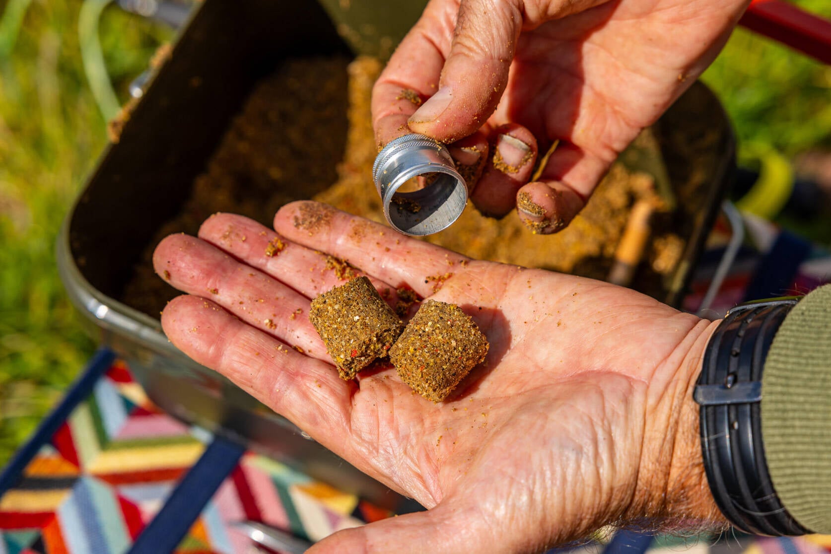 In plaats van het klassieke ‘voerbombardement’ waarmee wedstrijdvissers vaak hun sessie beginnen, kiest Tom liever voor een voeraanpak met balletjes van het formaat golfbal. “Door regelmatig kleine porties te voeren raakt de vis minder snel verzadigd, waardoor ze actiever blijven azen”, legt hij uit. “Bovendien ben je op deze manier minder gebonden aan één voerplek. Werp je bijvoorbeeld een stukje opzij, dan kun je met twee balletjes voer – en eventueel wat aas – de aanwezige vis snel naar die plek lokken.”