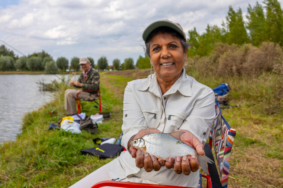 Fousjia heeft tot dan toe nog geen actie gehad, maar na een poosje begint het ook bij haar te lopen. Na aanvankelijk vooral kleinere vis te hebben gevangen, melden zich nu ook af en toe wat grotere brasems – en komt het landingsnet goed van pas. “Zeker aan dit slag vissen heb je met licht materiaal nog hele leuke sport”, zegt Tom terwijl Fousjia de vangst voor hem schept. “De vis aast ook gretiger, want de haak zit bij dit exemplaar wat dieper.” Met behulp van een onthaaktangetje is het klusje echter snel geklaard en gaat de vis vlot weer terug.