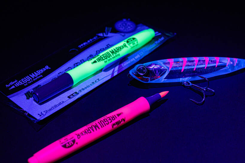 Met de Iregui Markers van Sakura valt je kunstaas beter op in lichtarme omstandig­heden. Schijn UV-licht op de fluores­cerende accenten die je hebt aangebracht op bijvoorbeeld soft- en hardbaits, zodat de ‘versiering’ blauw oplicht. Waterbestendig, snel­drogend en verkrijgbaar in vier matte en vijf glanzende UV-kleuren.
