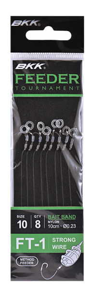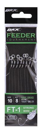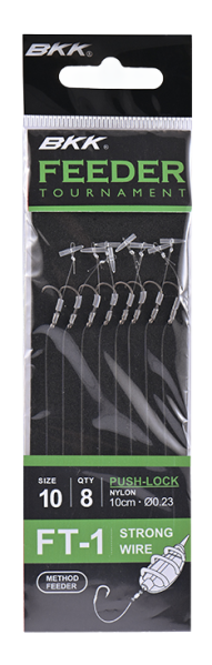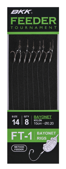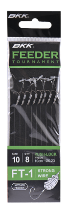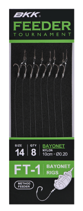De BKK Feeder Tournament Rigs zijn speciaal ontwikkeld voor de methodfeeder visserij. De korte onderlijnen (10 cm) hebben sterke haken (maat 6 tot 14) met een Super Slick afwerking die zorgt voor een gladder oppervlak, betere penetratie en langere levensduur. De onderlijnen van Japans kwaliteitsnylon én braid hebben verschillende aashouders: bayonet, bait band en push-lock. Verkrijgbaar met of zonder weerhaak.