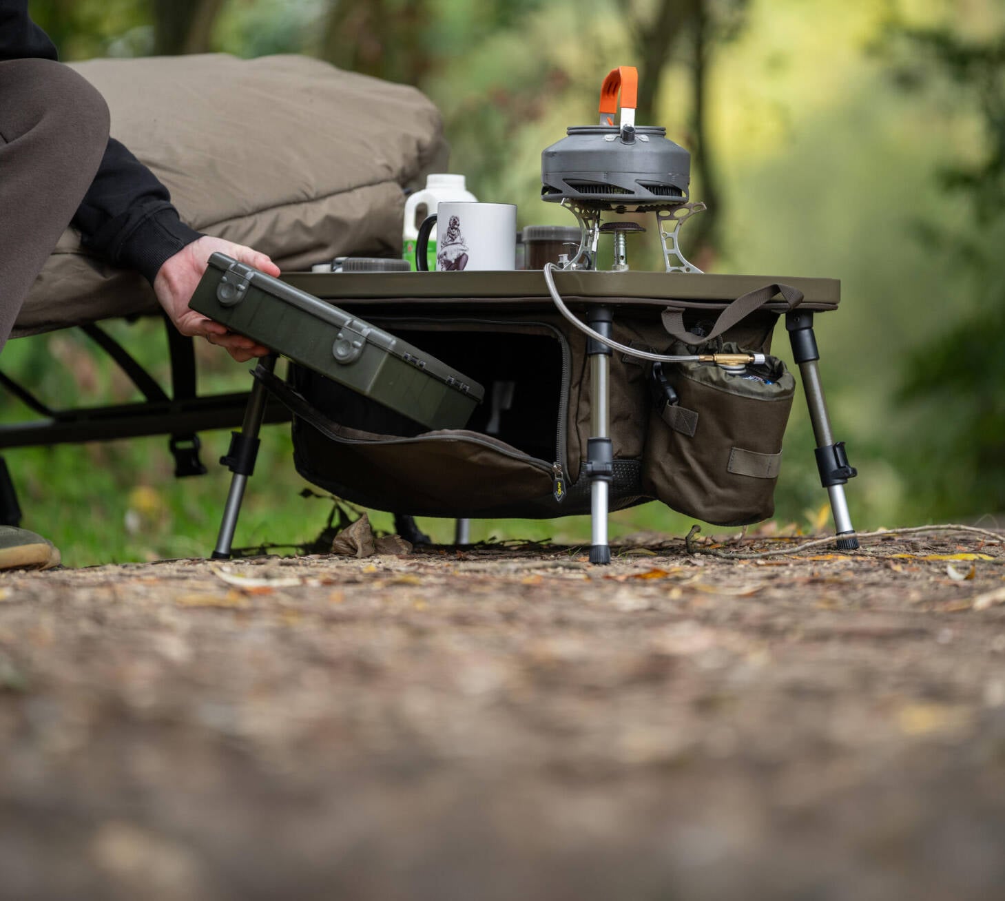 De Avid Bivvy Organiser XL is een compacte, opvouwbare bivvy-tafel. In het handig ­ingebouwde ondervak kun je tackleboxen of kookgerei kwijt, aan de zijkant zit een clip-on gasfleshouder. De multifunctionele tafel heeft vier inklapbare en verstelbare poten en wordt geleverd in een praktische draagtas. Afmetingen: 60×35×25-35 cm.