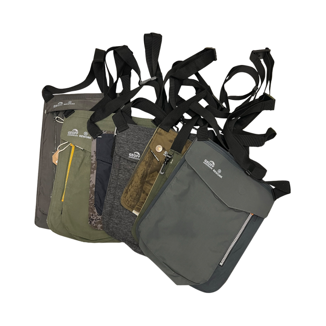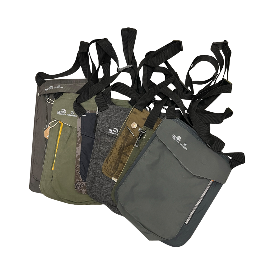 De Upcycled Chest Pocket Bags van Geoff Anderson zijn unieke items. Ze worden