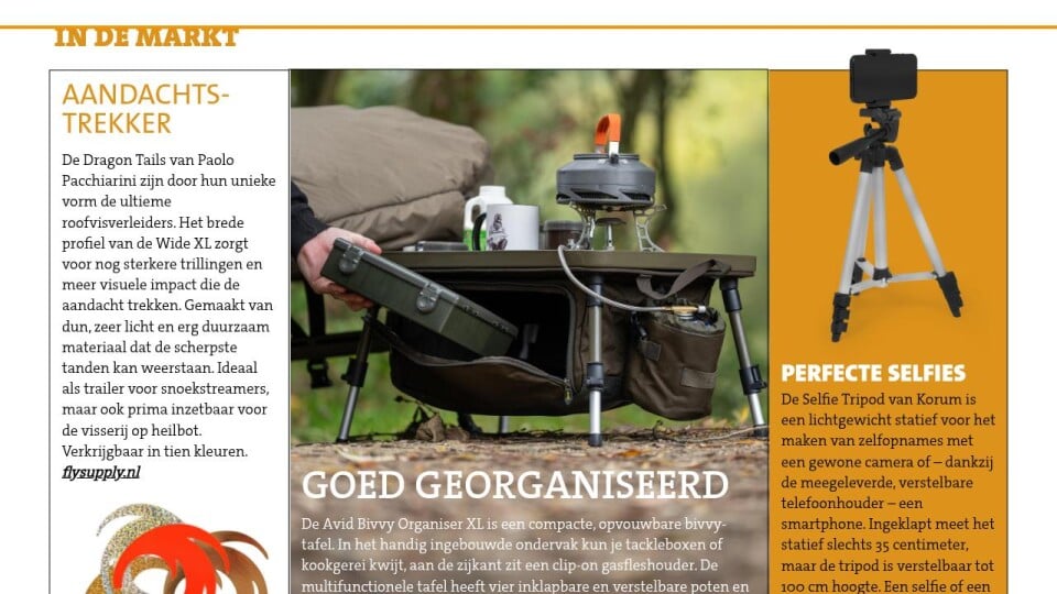 De Selfie Tripod van Korum is een lichtgewicht statief voor het maken van zelfopnames met een gewone camera of – dankzij de meegeleverde, verstel­bare telefoonhouder – een smartphone. Ingeklapt meet het statief slechts 35 centimeter, maar de tripod is verstelbaar tot 100 cm hoogte. Een ­selfie of een filmpje maken met een mooie vangst is zo een koud kunstje!