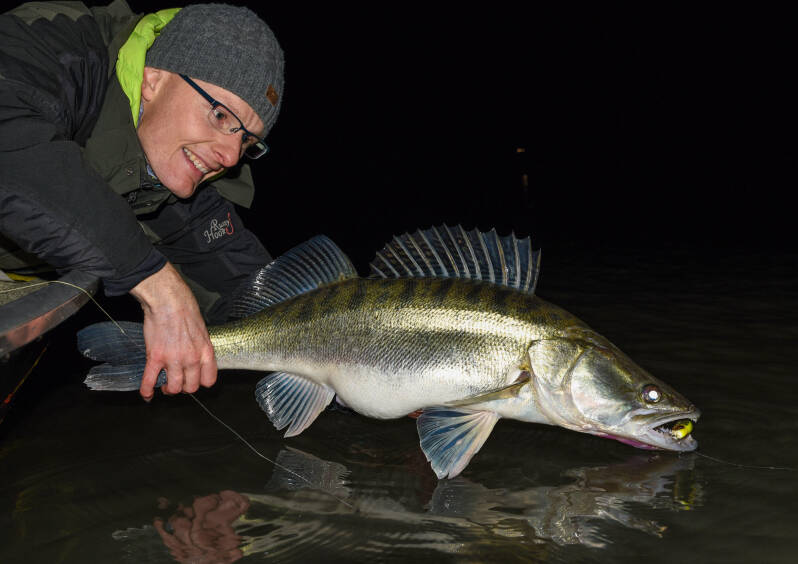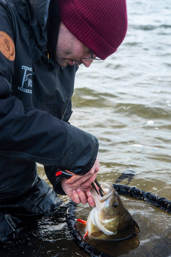 Voor het onthaken van grote baarzen vanuit de bellyboat of bij het wadend vissen houdt Willem de vis meestal vast bij de bek – zoals eerder beschreven – en laat hij het lijf in het water hangen zodat dit de vis ondersteunt. “Met een tangetje is het kunstaas dan vaak in een handomdraai verwijderd.” Op de kant of in de boot komt de vis steevast op een zachte en natte ondergrond te liggen; bij voorkeur een onthaakmat. Willem: “Zet baarzen altijd snel weer netjes terug en bewaar ze zeker niet in een schepnet. Dan kan de zwemblaas uitzetten en heeft de vis mogelijk veel moeite om weer op diepte te komen.”