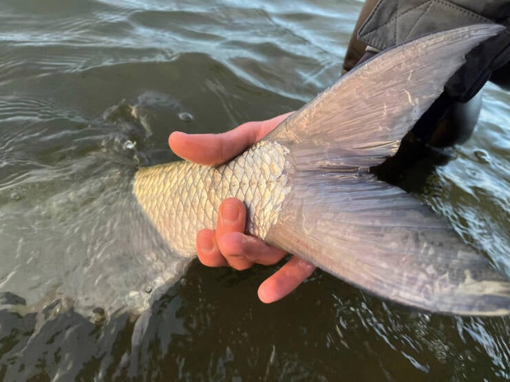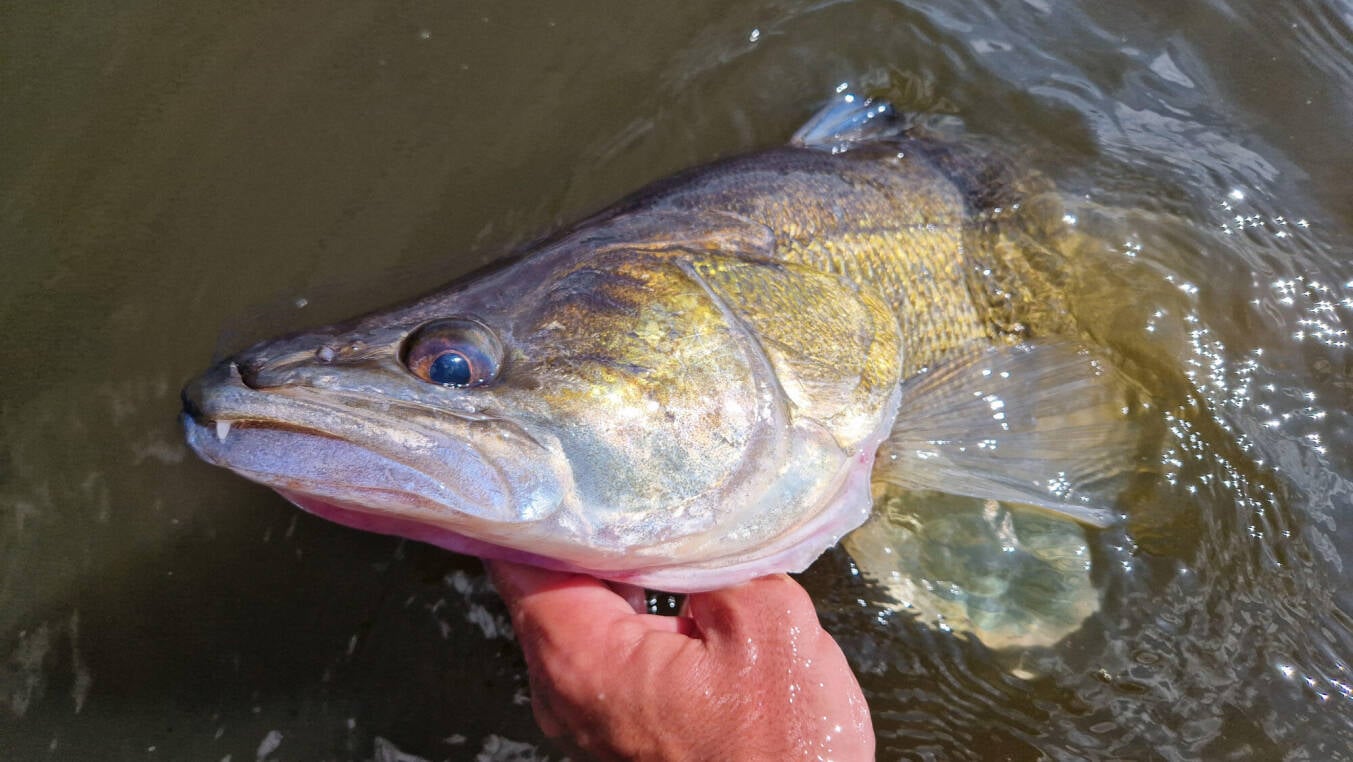 Hoewel Michel zijn net altijd bij zich heeft, bekijkt hij telkens per situatie hoe de landing aan te pakken. “Als ik prima bij de vis kan – bijvoorbeeld vanuit de boot of als ik wadend vis – en het kunstaas keurig voor in de bek zit, tik ik de haak vaak in het water los met een tang. Dan heeft de vis meteen zijn vrijheid terug. Kleine roofbleien (tot zo’n zestig centimeter) kun je prima achter de kop vastpakken, bij grotere exemplaren werkt de staartlanding beter. Grijp de vis daarvoor vast bij de staartwortel, ondersteun hem met je andere hand onder de buik en til hem dan pas uit het water.”