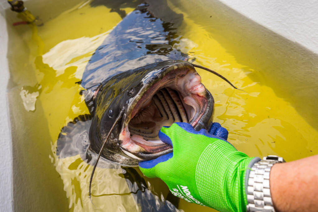 Een werkhandschoen is handig om de meerval in zijn bek vast te kunnen pakken