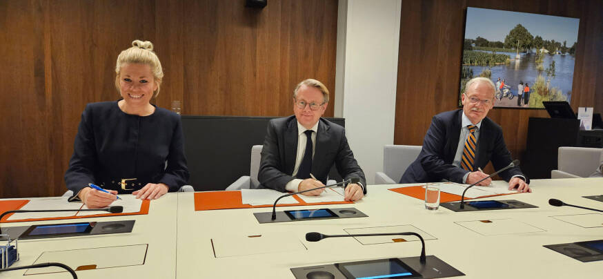 Ondertekening van de Samenwerkingsovereenkomst Sportvisserij Loodvrij 2026-2029 door v.l.n.r. Piëtte van Hoorn (adjunct-directeur Sportvisunie), Robert Tieman (Minister van Infrastructuur en Waterstaat) en Jean Rummenie (Staatssecretaris van Landbouw, Visserij, Voedselzekerheid en Natuur van Nederland).