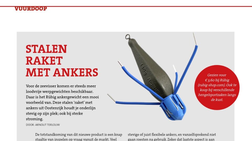 Voor de zeevisser komen er steeds meer loodvrije werpgewichten beschikbaar. Daar is het Rübig ankergewicht een mooi voorbeeld van. Deze stalen ‘raket’ met ankers uit Oostenrijk houdt je onderlijn stevig op zijn plek; ook bij sterke stroming.