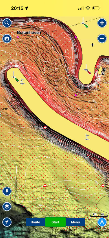 Met de meetfunctie kun je checken of deze stekken binnen werpbereik liggen. Marker A plaats je op de plek waar je hengels staan, marker B zet je bijvoorbeeld onder aan het talud waar je de vis verwacht. Door de afstand tussen A en B af te lezen weet je exact hoe ver je moet werpen. Heb je eenmaal een productieve stek gevonden, dan maak je een marker aan. Zo hoef je een volgende keer niet te zoeken naar de exacte stek, maar weet je precies waar je moet zijn. Op mijn favoriete strand markeer ik bijvoorbeeld ieder jaar de zandbanken met muien en zwinnen. Dan weet ik bij hoogwater waar de zeebaars zal gaan jagen.