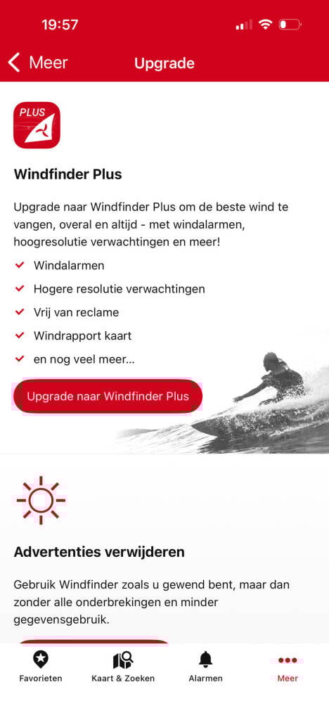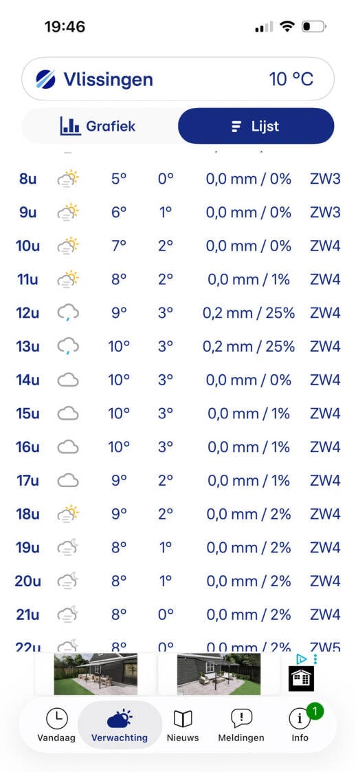 Buienradar geeft ook de de windkracht en -richting aan. Dit is een heel belangrijke variabele om rekening mee te houden. Zelfs zo belangrijk dat we de windverwachting beter kunnen bekijken op een andere app die speciaal voor de windverwachting in het leven is geroepen.