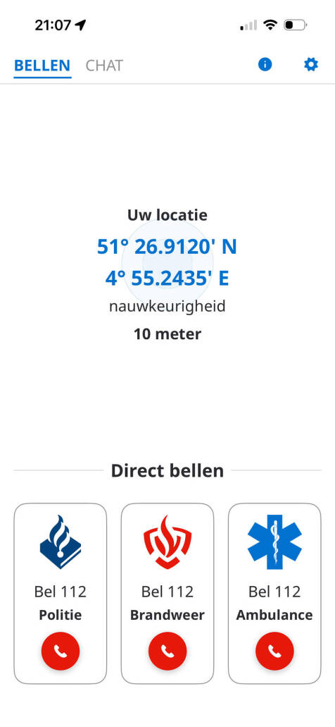 Deze app weet exact waar je bent en stuurt bij gebruik jouw coördinaten door naar de hulpdiensten. De bediening is erg eenvoudig. Bij het openen van de app heb je drie keuzes: ambulance, politie of brandweer. Druk op het icoontje van de door jou gewenste hulpdienst en de coördinaten van je locatie worden direct verzonden. Na je keuze word je direct – zonder tussenkomst van een keuzemenu – verbonden met de noodcentrale die je verder helpt terwijl er al hulp onderweg is. De 112NL app werkt altijd. Je hebt geen bereik nodig, enkel een paar procent batterijvermogen. Ga dus steevast op pad met een telefoon die voldoende is opgeladen. Zo ben je in staat om in noodgevallen sneller én gericht hulp in te schakelen.