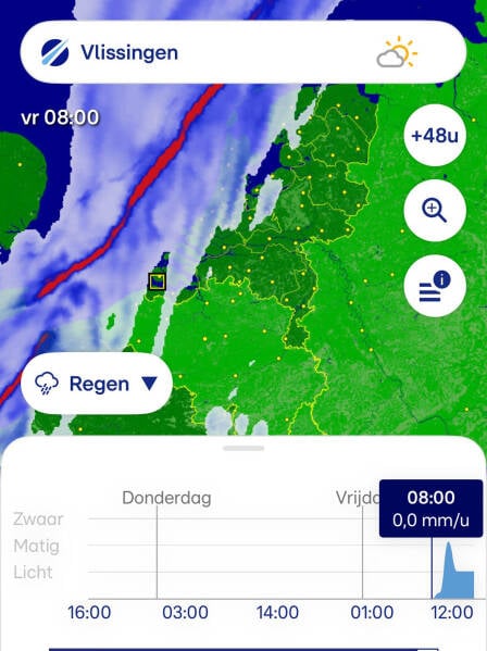 Waar in Nederland je ook gaat vissen, Buienradar kan voorspellen of en hoeveel neerslag eraan komt. Voer in de zoekbalk de plaatsnaam in van de door jou gekozen visstek en je krijgt de lokale buienverwachting weergegeven. Je kunt de verwachting bekijken van de komende 3 tot 48 uur. Daarbij geldt wel dat hoe minder ver je vooruit kijkt, des te betrouwbaarder de verwachting is. Zo kun je thuis bepalen welke kleding je wel of juist niet mee dient te nemen naar de waterkant.