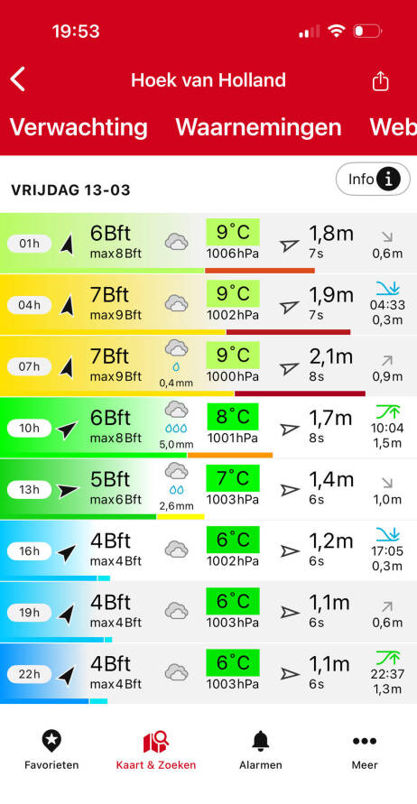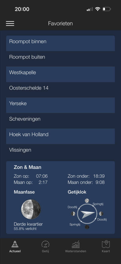 De invloed van het getij is niet te onderschatten. Stekken die met een opkomend tij nauwelijks of geen vis opleveren, kunnen met een afgaand tij juist erg productief zijn. Een goede getijden app is dan ook onmisbaar bij het plannen van je sessie.Open je de app Het Getij, dan kom je meteen in een scherm met je favorieten. Hier kies je de voor jou zeven belangrijkste locaties waarvan je het getij regelmatig bekijkt. Dit scheelt een hoop scrollen tussen verschillende meetstations. Naast een accurate weergave van het getij vind je op het beginscherm ook de maanstand en de tijdstippen dat de zon en de maan opkomen en ondergaan.