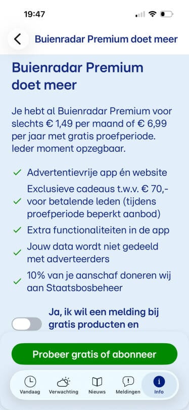 Bij veel apps heb je de keuze tussen een gratis of een betaalde versie. De gratis variant biedt doorgaans prima basiseigenschappen, een betaalde versie gaat net een stapje verder (uitgebreidere functies, meer nauwkeurige GPS, meer updates, zonder reclame en betrouwbaarder). Voor je overgaat naar een betaalde versie is het vaak mogelijk om die eerst een poosje uit te proberen. Daar kun je handig gebruik van maken als je het slim speelt. Download de proefversie net voor je vakantie of vistrip, zodat je van alle functies profiteert zonder direct ergens aan vast te zitten.