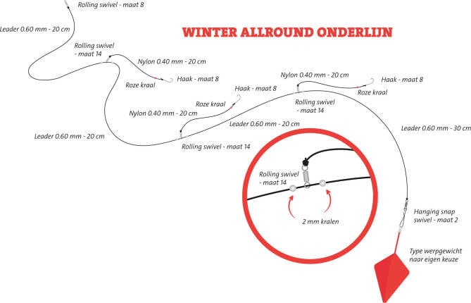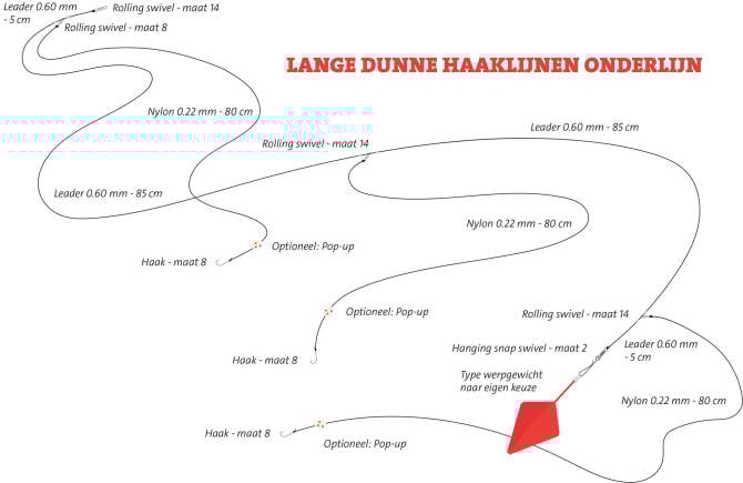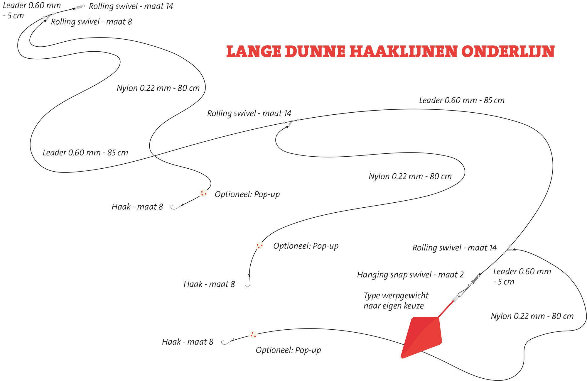 De zomervariant van deze onderlijn heeft langere en dunnere haaklijnen – ga zo dun als de omstandigheden en vissoort toelaten – voor een natuurlijke aaspresentatie gericht op o.a. bot en zeebaars. Dit betekent dat de hele onderlijn een stuk langer wordt. De staande lijn moet immers voldoende lengte hebben zodat de haaklijnen elkaar niet raken. Om deze niet té lang te maken wordt de onderste haaklijn dichter bij de hanging snap swivel geplaatst. Zo vis je met twee haaklijnen boven het werpgewicht en één eronder. In sommige situaties heeft dit als bijkomend voordeel dat je meerdere dieptes in de waterkolom bevist. Voor soorten als zeebaars kan dit soms net het verschil maken. Sta je met deze onderlijn aan het strand en komt het geheel na het indraaien als een rommeltje terug, dan weet je nu zelf wat je kunt aanpassen. Zoek het eerst in dikkere haaklijnen – stapsgewijs van 22/00 richting 35/00 – en kort als dat niet werkt de lengte van de haaklijnen in.