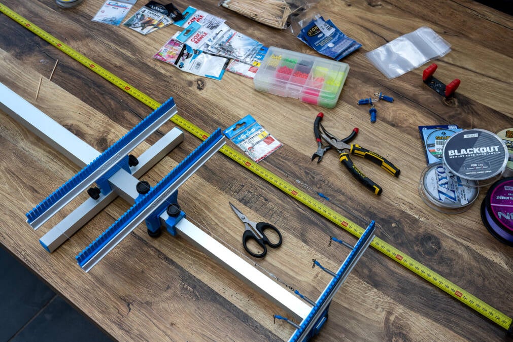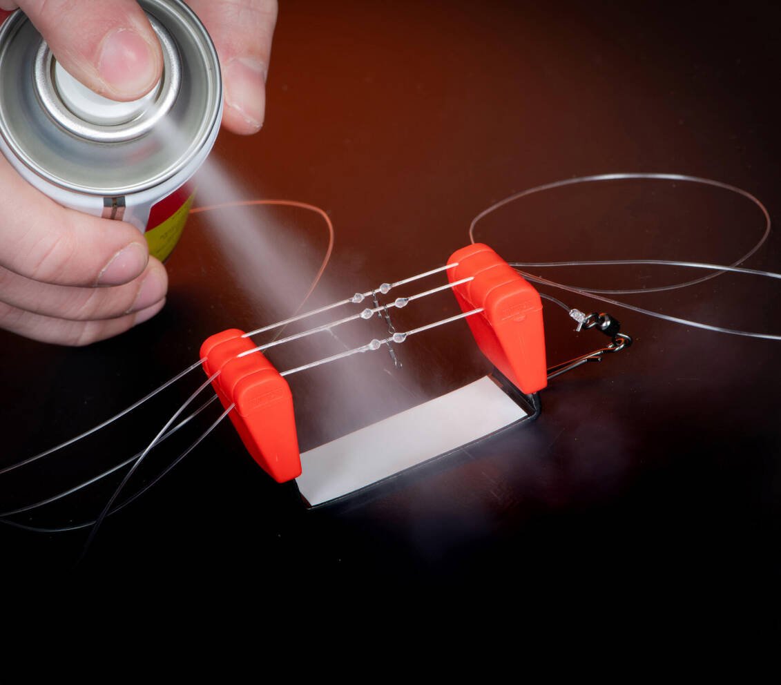 Ga je zelf onderlijnen lijmen, dan is het belangrijk dat er spanning staat op de staande lijn. Dit kun je doen met eenvoudige tools als een Rig Jig, maar je kunt ook kiezen voor een complete lijmbank. Schuif alles in de juiste positie en breng met een cocktailprikker een druppeltje lijm aan op de kraal (doe dit er aan de bovenkant op en ‘vang’ hem aan de onderkant weer op). Spuit er vervolgens activator spray op en alles zit direct muurvast op zijn plek. Nadat je de onderlijn hebt voltooid, wikkel je deze op een rig winder om hem netjes en compact te bewaren in een rig box.