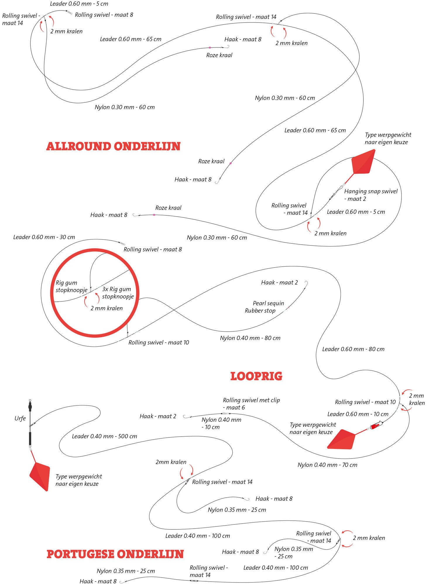 Per type onderlijn zijn er soms ook weer verschillende uitvoeringen bekend. Zoals varianten op de aan onze kust vaak gebruikte 3 haaks flapper. In Engeland noemen ze deze montage een ‘scratching rig’, oftewel een allrounder waar je van alles mee kunt vangen. Het is – zoals de naam al zegt – een onderlijn met drie wapperlijnen. Van deze standaardmontage kun je diverse varianten maken door simpelweg te kiezen voor een dikkere of dunnere staande lijn en te spelen met de lengte van de haaklijnen. Dit kan bijvoorbeeld resulteren in een korte, vrij stugge winteronderlijn voor schar en wijting, of juist een lichte, lange versie voor de zomervisserij op bot en zeebaars.