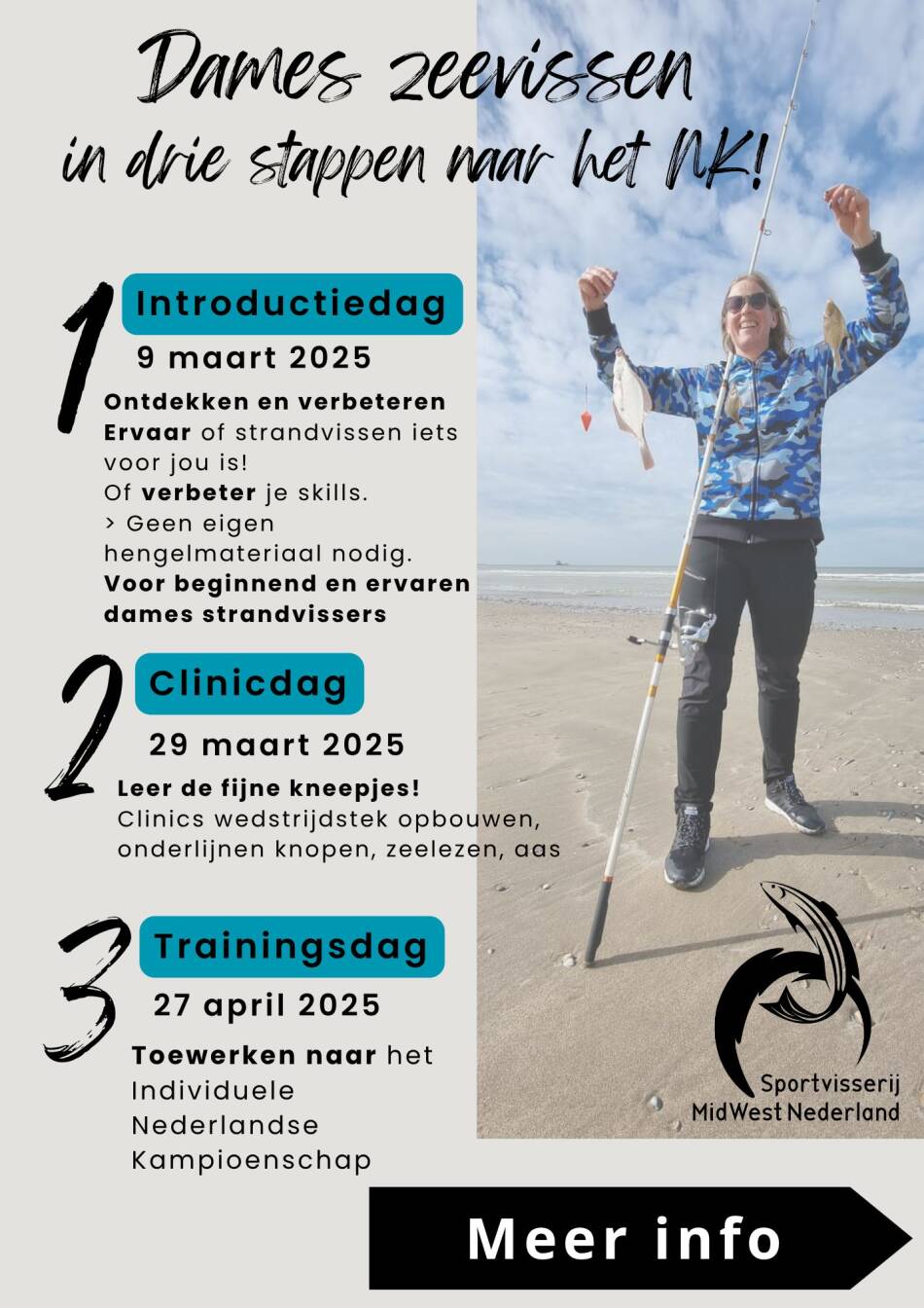 In maart en april werden er door MidWest drie kustvisdagen georganiseerd. Met de flyer In drie stappen naar het NK! werden dames uitgedaagd om zich in te schrijven voor drie kustvisdagen en toe te werken naar het INK.